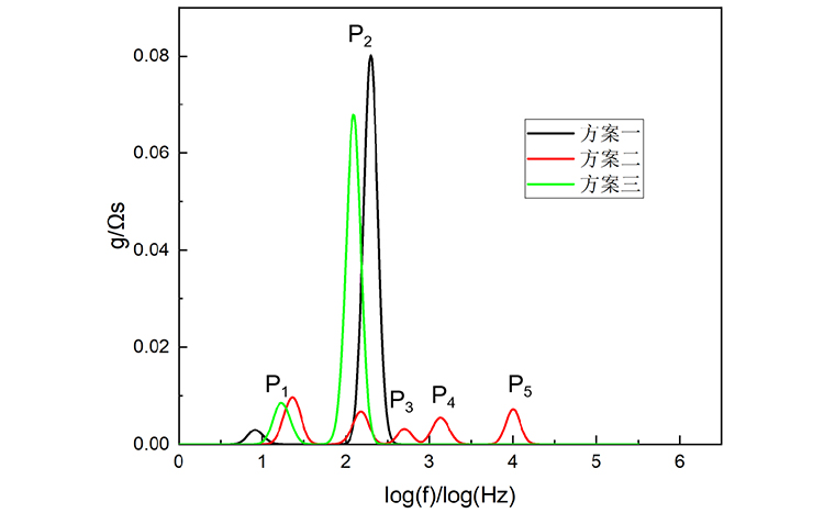 本文基于DRT相关分析,进一步探究了电源回路影响。从图3可以看出,当采用电化学工作站进行拉载,且电源断开时(方案二),DRT分析能够解出较为完整的解。但是在电源回路接入时,由于电源的影响,实际上P2峰是在电源影响下的峰,其并不能代表单池的高频阻抗,反而跟单池的阳极传质极化在频率上有一定的重合。从图2也可以看出,电源回路接入之后,高频部分交点发生大幅度的偏移,这一点从DRT图中更加明显。另外,在低频条件下,电源的接入也会对单池的阻抗特性产生一定的影响,特征频率点发生偏移。